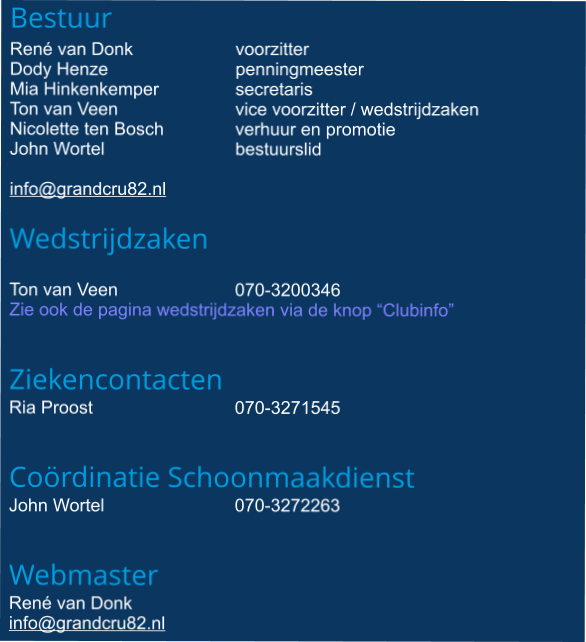 AdresBoulodrômeFluitpolderplein 1b2262 ED LeidschendamTel: 070-2224000E-mail: info@grandcru82.nlSpeeltijdendinsdag13:30 - 16:3019:30 - 22:15donderdag13:30 - 16:30vrijdag 19:30 - 22:15zaterdag*13:30 - 16:30zondag * 13:30 - 16:30* Op dagen dat er NPC gespeeld wordt kan er niet vrij gespeeld worden in de hal.* In de zomermaanden zijn wij wisselend op een zaterdag of een zondag gesloten, zie voor informatie het Bar/ Kantinedienst rooster!