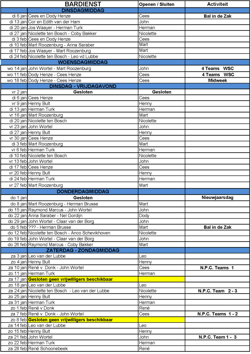 Bardienst en openen/sluiten: Januari / Februari 2026